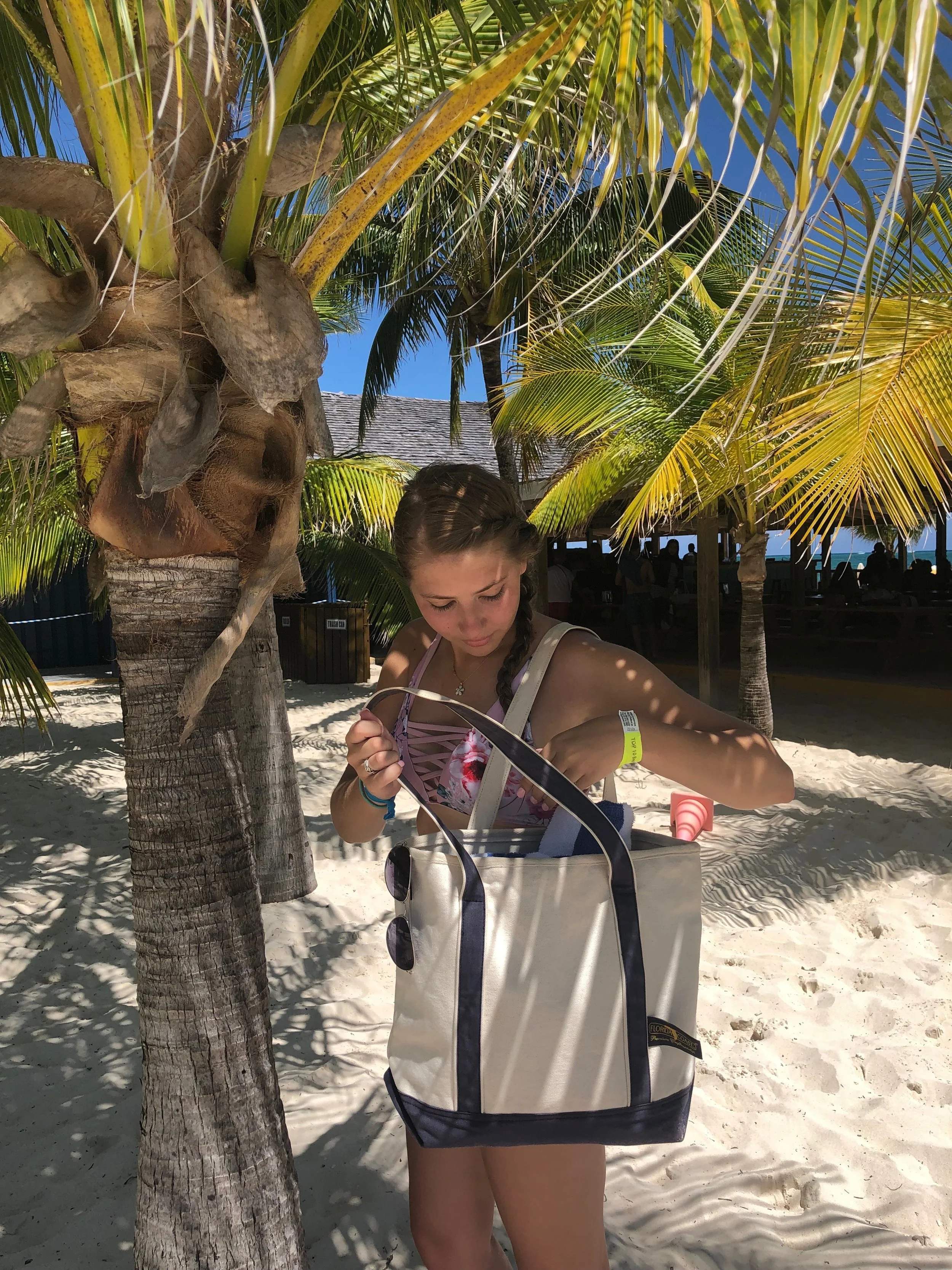 A customer favorite bag for the beach is the Navy tote (comes in small, large and extra large) Perfect bag to hold everything you need for you beach day, towel, clothes, water, food, sunscreen, whatever you need to make your day perfect. Also has a special feature’s including a inside zipper compartment for wallets and valuables and a key fob which keys your car or house keys in easy reach. Our other canvas products are great for the beach because of their durability. Perfect to collect sea shells with and play around with in the sand or water!
